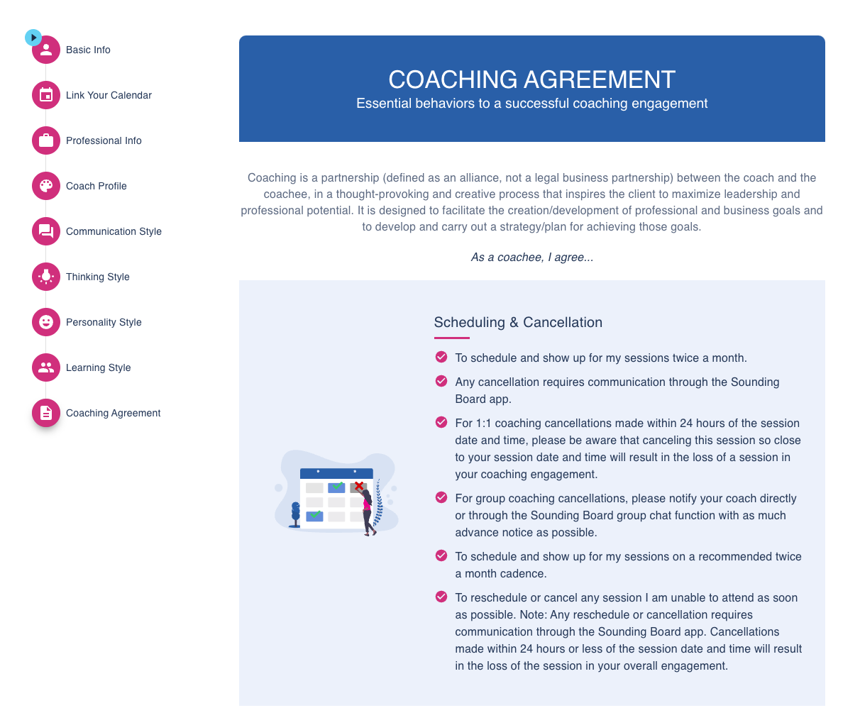 Below is an outline of the coaching agreement that pertains to Sounding Board Guide coachees, individuals whose coaches are subcontractors of Sounding Board. These details are presented to applicable users during the onboarding process.