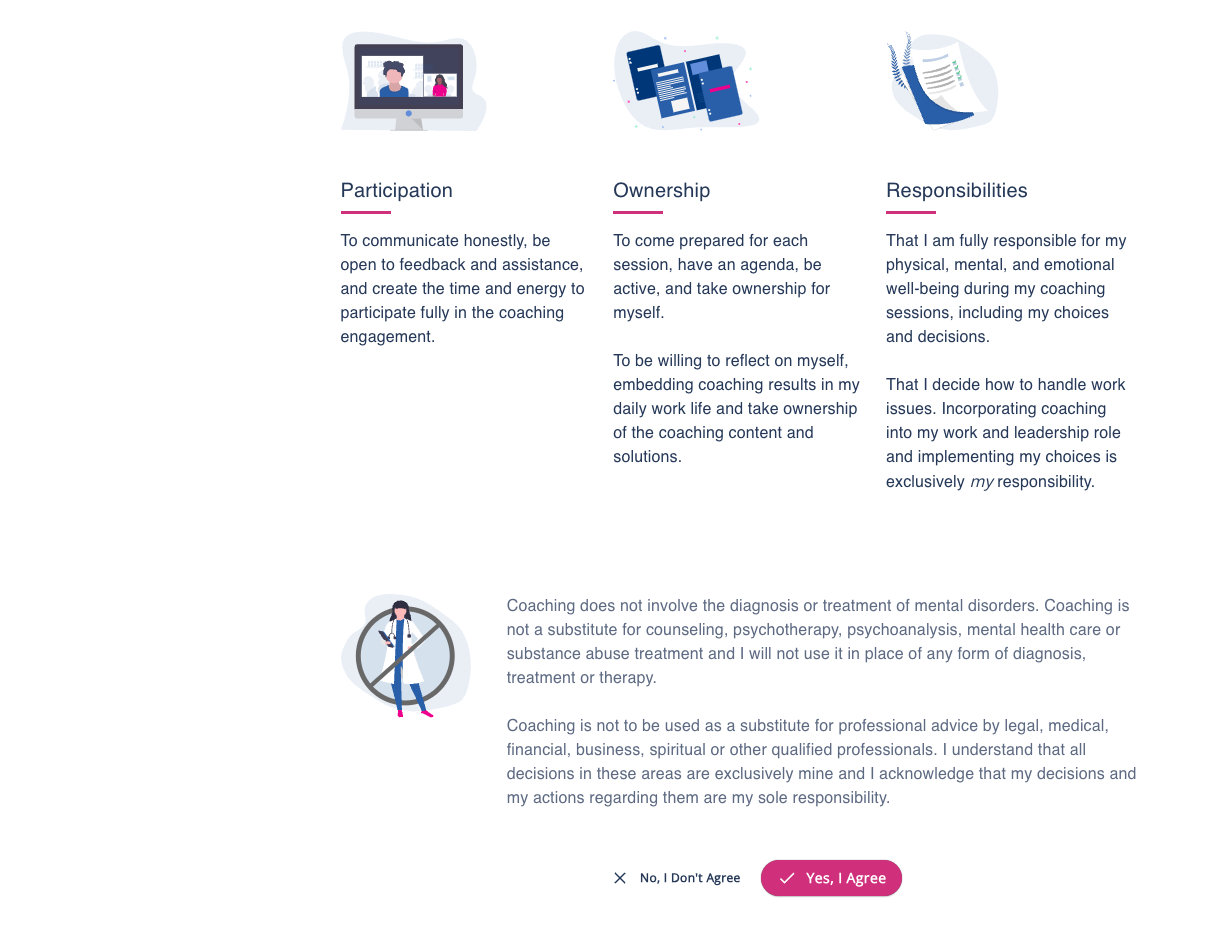That I am fully responsible for my physical, mental, and emotional well-being during my coaching sessions, including my choices and decisions.