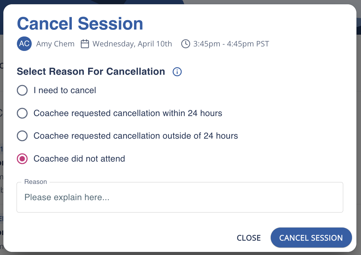 - Coaches can no longer excuse sessions. All sessions cancelled less than 24 hours before the session are unexcused and counted towards a user's maximum number of sessions.