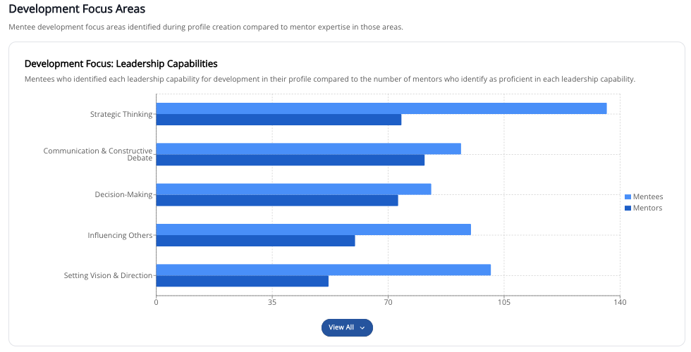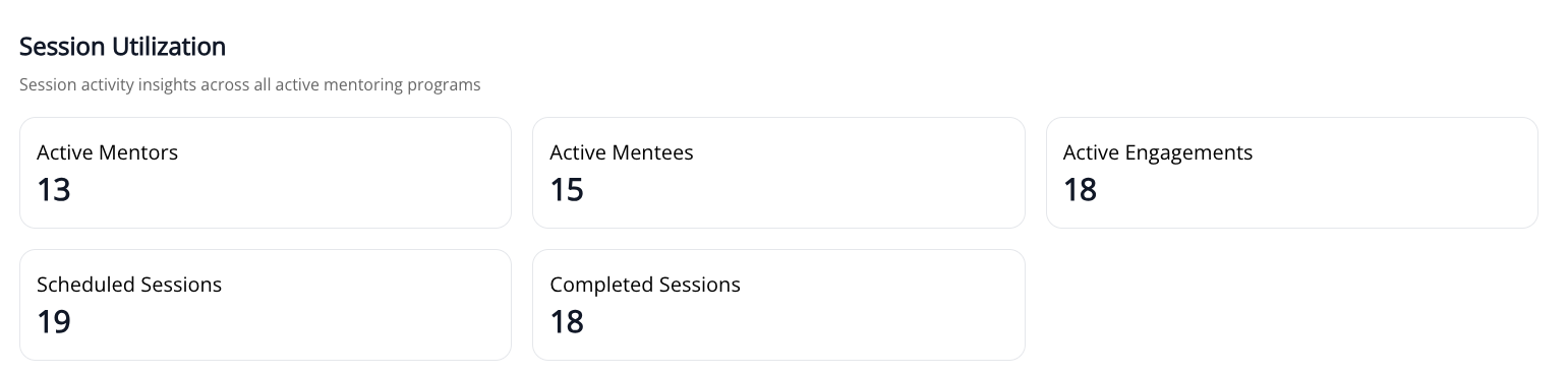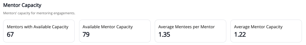 - In the Mentor Capacity section of the Engagement tab, added new "Mentors with Available Capacity", "Available Mentor Capacity", "Average Mentees per Mentor" , and "Average Mentor Capacity" cards