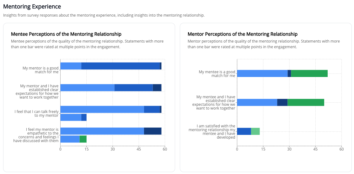 - In the Mentoring Experience section of the Impact tab, added "Mentee Perceptions of the Mentoring Relationship" and "Mentor Perceptions of the Mentoring Relationship" charts