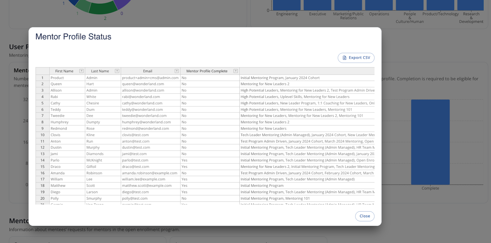 - Admins can click on the Mentor Profile Status and Mentee Profile Status cards to view a list of users in each status