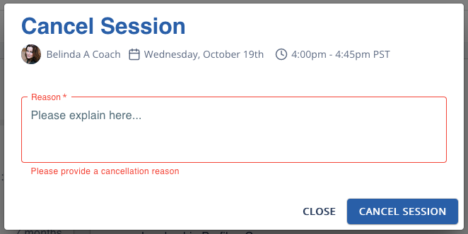 Cancellation reason is now a required field when coachee cancels within 24 hours of session