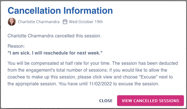 When the coachee cancels a session within 24 hours, the in-app notification to the coach has been updated to let the coach know the coachee’s cancellation reason and that the coach has 2 weeks to excuse the cancelled session