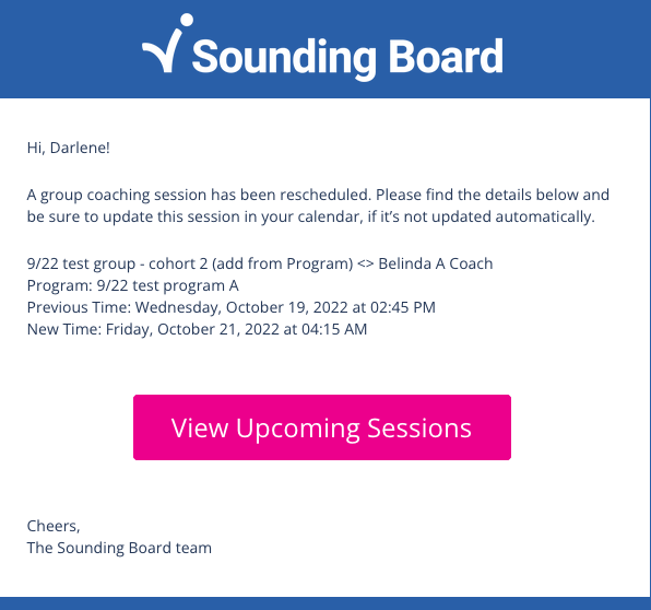 Notification emails are now sent to all users involved in a group coaching engagement when a session is cancelled or rescheduled